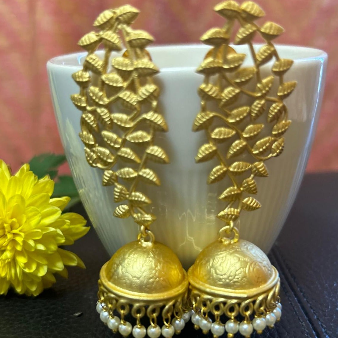 Elevate your style with our Golden Leaf Earrings featuring a delicate pearl Jhumka. The intricate golden leaf design adds a touch of luxury and sophistication to any outfit. These earrings are the perfect statement piece, reflecting your refined taste. Own your elegance with these exclusive earrings.
